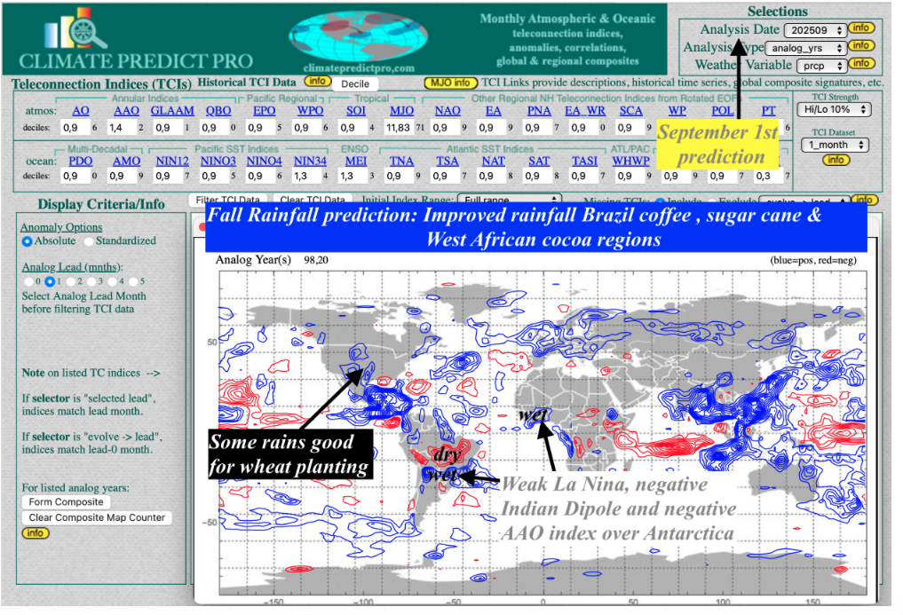 Most recently, a developing La Niña event combined with a negative Indian Ocean Dipole in the Pacific and a weak negative Antarctic Oscillation Index is causing bear markets in cocoa and sugar. Coffee prices may be next (especially if trade tariff tensions ease with Brazil), as we have been predicting the end of Brazil's multi-year drought for two months.